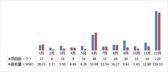 從各月份并網(wǎng)情況上看,如圖3所示,2017年6月和12月新增并網(wǎng)非戶用分布式光伏項目數(shù)量和裝機容量驟增,達(dá)到兩個小高峰,尤其是12月新增項目數(shù)量和裝機容量超過全年的三分之一。