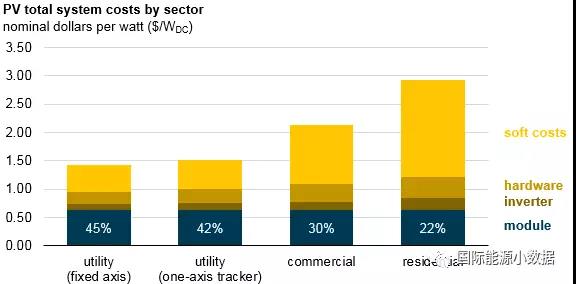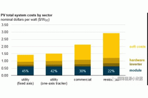 光伏系統(tǒng)成本包括硬件成本(光伏組件、逆變器等)和軟性成本(營銷、勞動力、許可證、檢測、并網(wǎng)等),雖然硬件成本不斷降低,但是硬件占整個(gè)光伏系統(tǒng)的比例有多大呢?我們來看美國的情況。 根據(jù)美國可再生能源實(shí)驗(yàn)室(NREL