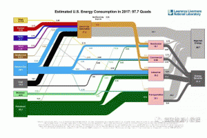 美國勞倫斯·利佛莫爾(Lawrence Livermore)國家實驗室日前發(fā)布2017年版美國能流圖(Energy Flow Chart)。當年全美能耗為97.7夸德(Quads,1夸德相當于2400百萬噸石油),按中國計量習慣約合35億標準煤。作為對比,中國2017年的能源消費為44.9億噸標準煤。
