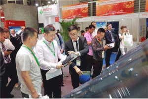 ↑參展商正在給客戶介紹光伏產(chǎn)品 本報記者 王軼辰攝