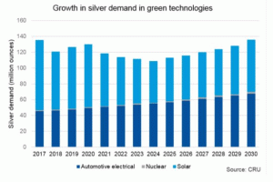 因此,CRU專家預測,光伏產(chǎn)業(yè)的白銀需求量將達到每年約7000萬至8000萬盎司,直至20世紀20年代中期下降至5000-5500萬盎司。到2030年,預計需求將恢復,每年約為6600萬盎司。