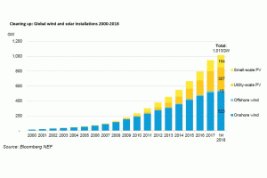 據(jù)彭博新能源財(cái)經(jīng)(BloombergNEF)報(bào)道,2018年上半年風(fēng)電和太陽能的裝機(jī)量超過1太瓦。根據(jù)其最新研究,以中國為首的亞洲裝置的大量部署實(shí)現(xiàn)了這一里程碑。