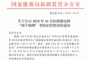 11月21日,國家能源局新疆監(jiān)管辦發(fā)布關(guān)于公示2018年10月份新疆電網(wǎng)“兩個細則”考核補償情況的通知。