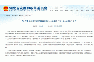 據(jù)湖北省發(fā)改委官網(wǎng)消息:新年伊始,湖北省發(fā)改委發(fā)布《新能源發(fā)電項(xiàng)目省級電價補(bǔ)貼金額(2016-2017年)公示》,初步認(rèn)定:2016-2017年補(bǔ)貼資金共計(jì)62447.45萬元,其中集中式光伏電站23個,補(bǔ)貼金額16311.46萬元;風(fēng)電項(xiàng)目33個,補(bǔ)貼金額42059.28萬元;沼氣發(fā)電項(xiàng)目3個,補(bǔ)貼金額19.3萬元;非自然人分布式光伏發(fā)電項(xiàng)目309個,補(bǔ)貼金額3796.2萬元;自然人分布式光伏發(fā)電項(xiàng)目566個,補(bǔ)貼金額261.2萬元。