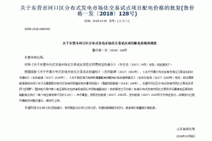 《批復》表示:東營市河口區(qū)分布式發(fā)電市場化交易試點項目“過網費”,暫按電力用戶接入電壓等級對應的省級電網公共網絡輸配電價(含政策性交叉補貼)扣減分布式發(fā)電市場化交易所涉及最高電壓等級的輸配電價執(zhí)行(每個電壓等級每千瓦時1.5分)。自2019年1月1日起施行,有效期至2023年12月31日。