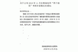 國家能源局西北監(jiān)管局日前公布了《2018年11月份青海電網(wǎng)“兩個細則”考核補償結(jié)果》,請有關(guān)發(fā)電企業(yè)據(jù)此結(jié)算。2018年11月份青海電網(wǎng)“兩個細則”考核補償結(jié)果