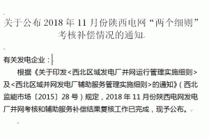 據(jù)國(guó)家能源局西北監(jiān)管局日前印發(fā)的《關(guān)于公布2018年11月份陜西電網(wǎng)“兩個(gè)細(xì)則”考核補(bǔ)償情況的通知》,根據(jù)《關(guān)于印發(fā)<西北區(qū)域發(fā)電廠并網(wǎng)運(yùn)行管理實(shí)施細(xì)則>及<西北區(qū)域并網(wǎng)發(fā)電廠輔助服務(wù)管理實(shí)施細(xì)則>的通知》(西北監(jiān)能市場(chǎng)〔2015〕28號(hào))規(guī)定,2018年11月份陜西電網(wǎng)發(fā)電廠并網(wǎng)