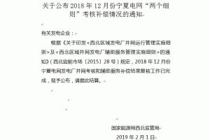 據(jù)國(guó)家能源局西北監(jiān)管局日前印發(fā)的《關(guān)于公布2018年12月份寧夏電網(wǎng)“兩個(gè)細(xì)則”考核補(bǔ)償情況的通知》,12月份寧夏電網(wǎng)發(fā)電廠并網(wǎng)考核和輔助服務(wù)補(bǔ)償結(jié)果復(fù)核工作已完成,現(xiàn)予公布,請(qǐng)有關(guān)發(fā)電企業(yè)據(jù)此結(jié)算。