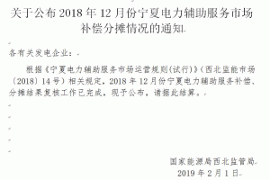 據(jù)國(guó)家能源局西北監(jiān)管局日前印發(fā)的《關(guān)于公布2018年12月份寧夏電力輔助服務(wù)市場(chǎng)補(bǔ)償分?jǐn)偳闆r的通知》,根據(jù)《寧夏電力輔助服務(wù)市場(chǎng)運(yùn)營(yíng)規(guī)則(試行)》(西北監(jiān)能市場(chǎng)〔2018〕14號(hào))相關(guān)規(guī)定,2018年12月份寧夏電力輔助服務(wù)補(bǔ)償、分?jǐn)偨Y(jié)果復(fù)核工作已完成,現(xiàn)予公布,有關(guān)發(fā)電企業(yè)據(jù)此結(jié)算。