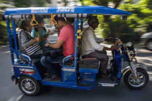 新德里市民乘坐電動(dòng)三輪車出行!陡2妓埂冯p周刊網(wǎng)站