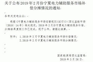 國家能源局西北監(jiān)管局今日(26日)印發(fā)《關(guān)于公布2019年2月份寧夏電力輔助服務(wù)市場補(bǔ)償分?jǐn)偳闆r的通知》。通知說,根據(jù)《寧夏電力輔助服務(wù)市場運(yùn)營規(guī)則(試行)》(西北監(jiān)能市場〔2018〕14號)相關(guān)規(guī)定,2019年2月份寧夏電力輔助服務(wù)補(bǔ)償、分?jǐn)偨Y(jié)果復(fù)核工作已完成,現(xiàn)予公布,請據(jù)此結(jié)算。