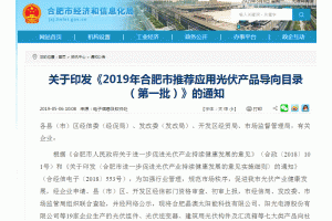 5月6日從合肥市經濟和信息化局官網獲悉:根據(jù)《關于印發(fā)《2019年合肥市推薦應用光伏產品導向目錄(第一批)》的通知》,經企業(yè)申請、縣(市)區(qū)、開發(fā)區(qū)經信部門資格審查、初審上報,合肥市經信局、發(fā)改委、市場監(jiān)管局組織聯(lián)合查驗,并經網絡公示,現(xiàn)將合肥晶澳太陽能科技有限公司、陽光電源股份有限公司等19家企業(yè)生產的光伏組件、光伏逆變器、建筑用光伏構件及匯流箱等七大類產品向社會推薦。
