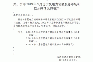 國家能源局西北監(jiān)管局今日公布了2019年3月份寧夏電力輔助服務(wù)市場補償分?jǐn)偳闆r。詳情如下: