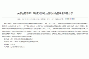 合肥市發(fā)改委23日印發(fā)《關(guān)于合肥市2018年度光伏電站度電補(bǔ)貼目錄名單的公示》。公示表示,根據(jù)《合肥市人民政府關(guān)于促進(jìn)光伏產(chǎn)業(yè)持續(xù)健康較快發(fā)展的若干意見》等有關(guān)文件要求,現(xiàn)將經(jīng)第三方會(huì)計(jì)師事務(wù)所審核確認(rèn)的合肥市2018年度光伏電站度電補(bǔ)貼目錄名單予以公示(詳見附件1—6),公示時(shí)間2018年9月23日至2018年9月27日。