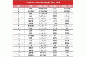2019年8月,光伏逆變器總出貨量達6.08GW,出口總額2.24億美元。其中,TOP20廠商出口總量達到5.13GW,出口總額達到了1.66億美元。其中華為出口額4944萬美元,出貨量1755MW,排名第一,陽光電源出口額3733萬美元,出貨量1570MW,位居第二,錦浪出口額1100萬美元,出貨量173MW,排名第三。