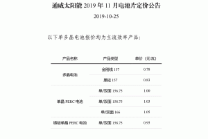 通威太陽能發(fā)布電池片價格明細(xì),與10月份價格相比單晶電池片完全一致,無變化,多晶電池片暴跌!