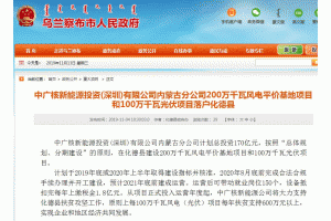 日前,烏蘭察布市人民政府發(fā)布《中廣核新能源投資(深圳)有限公司內(nèi)蒙古分公司200萬千瓦風(fēng)電平價(jià)基地項(xiàng)目和100萬千瓦光伏項(xiàng)目落戶化德縣》公告透露,中廣核新能源計(jì)劃總投資170億元,在化德縣建設(shè)200萬千瓦風(fēng)電平價(jià)基地項(xiàng)目和100萬千瓦光伏項(xiàng)目。