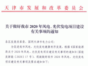 4月1日,天津市發(fā)展和改革委員會印發(fā)關于做好2020年風電、光伏發(fā)電項目建設有關事項的通知,要求積極推進平價上網(wǎng)項目建設,組織開展光伏發(fā)電項目補貼競價。2020年風電、光伏發(fā)電項目建設有關事項及要求通知如下: