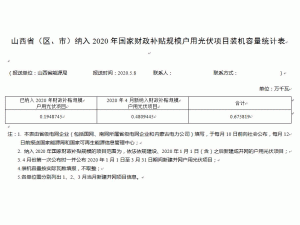 山西省能源局官網(wǎng)消息:經(jīng)國(guó)網(wǎng)山西省電力公司、山西地方電力有限公司統(tǒng)計(jì)匯總,現(xiàn)予以公示“山西省納入2020年國(guó)家財(cái)政補(bǔ)貼規(guī)模戶用光伏項(xiàng)目裝機(jī)容量統(tǒng)計(jì)表”、“山西省4月納入2020年國(guó)家財(cái)政補(bǔ)貼規(guī)模戶用光伏項(xiàng)目”。