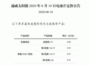 8月10日,在多晶硅料宣布提價至98元/kg之后,通威宣布電池調(diào)價,G1與M6單晶PERC報價0.97元/瓦,漲幅高達(dá)9%;156.75單晶單雙面PERC電池片價格上漲至0.95元/瓦。