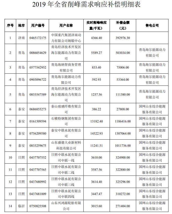 按照魯能源電力字〔2019〕176號文件明確的執(zhí)行效果評估和補(bǔ)償系數(shù)標(biāo)準(zhǔn)進(jìn)行測算,2019年全省迎峰度夏需求響應(yīng)共計(jì)補(bǔ)償1460.31萬元。其中,削峰需求響應(yīng)中17戶用戶符合補(bǔ)償條件,累計(jì)補(bǔ)償915.40萬元;填谷需求響應(yīng)中143戶用戶符合補(bǔ)償條件,累計(jì)補(bǔ)償544.91萬元。用戶補(bǔ)償明細(xì)見附件1和附件2。