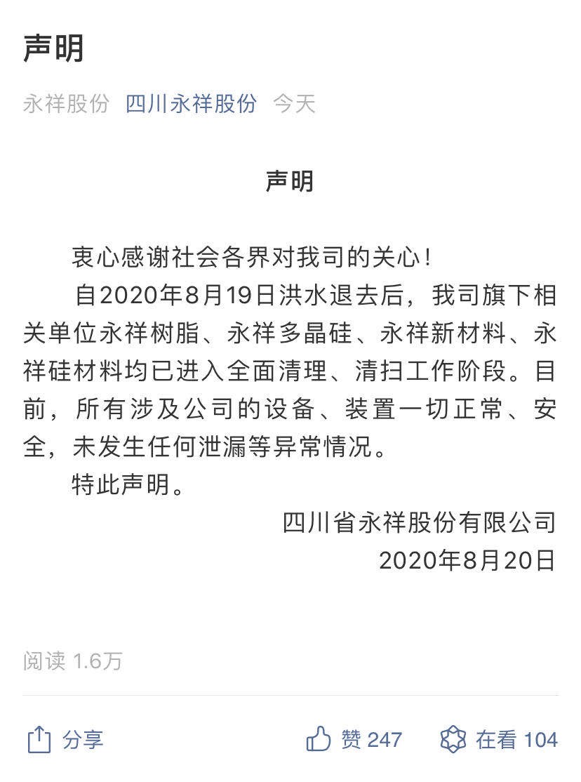 位于五通橋地區(qū)的四川省永祥股份有限公司(下稱“永祥股份”)在微信公眾號上發(fā)布聲明稱,自8月19日洪水退去后,公司旗下相關(guān)單位永祥樹脂、永祥多晶硅、永祥新材料、永祥硅材料均已進(jìn)入全面清理、清掃工作階段。目前,所有涉及公司的設(shè)備、裝置一切正常、安全,未發(fā)生任何泄漏等異常情況。