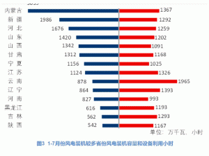 圖3 1-7月份風(fēng)電裝機(jī)較多省份風(fēng)電裝機(jī)容量和設(shè)備利用小時(shí)