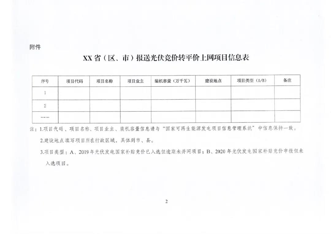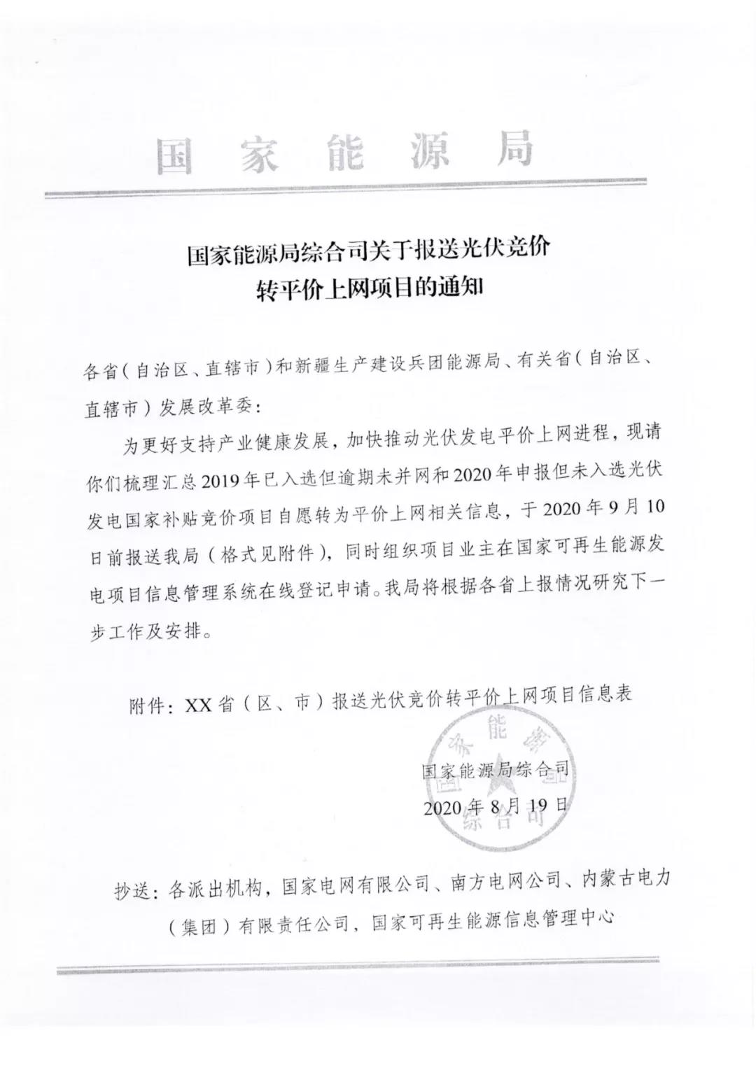 據(jù)光伏們消息:日前,各省主管部門收到國家能源局下發(fā)的《關于報送光伏競價轉平價上網(wǎng)項目的通知》,要求梳理競價項目自愿轉為平價的相關信息。根據(jù)文件,本次光伏競價轉平價項目報送僅限兩種光伏項目:一是2019年已經(jīng)入選競價項目但逾期并網(wǎng)的(即2020年6月30日之后并網(wǎng));二是2020年申報競價項目但未入選進入國家補貼名