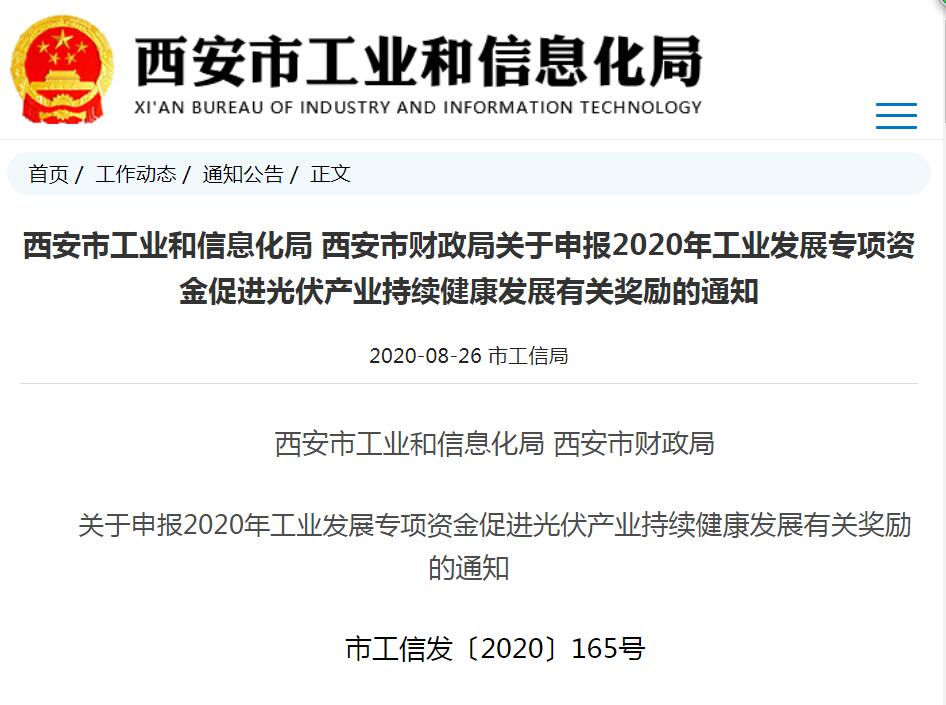 從西安市工信局官網(wǎng)獲悉:8月26日,西安市工業(yè)和信息化局 、西安市財(cái)政局聯(lián)合印發(fā)關(guān)于申報(bào)2020年工業(yè)發(fā)展專項(xiàng)資金促進(jìn)光伏產(chǎn)業(yè)持續(xù)健康發(fā)展有關(guān)獎(jiǎng)勵(lì)的通知,根據(jù)市政府《關(guān)于促進(jìn)光伏產(chǎn)業(yè)持續(xù)健康發(fā)展實(shí)施意見的通知》文件精神,決定組織開展2020年光伏產(chǎn)業(yè)發(fā)展獎(jiǎng)勵(lì)項(xiàng)目申報(bào)工作,對(duì)企業(yè)符合《光伏制造行