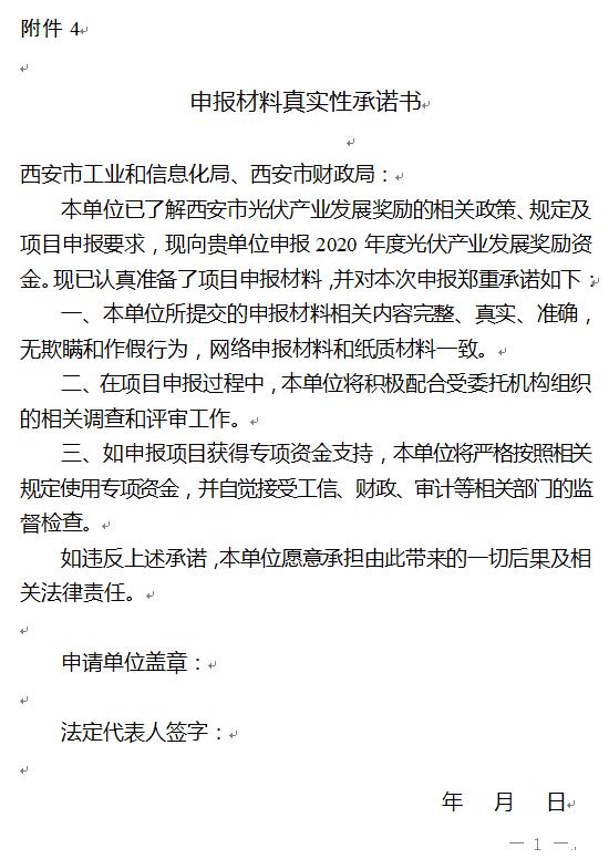 2.企業(yè)申請(qǐng)報(bào)告。申報(bào)企業(yè)以正式文件向市工信局、市財(cái)政局提交“關(guān)于申請(qǐng)西安市2020年光伏產(chǎn)業(yè)發(fā)展獎(jiǎng)勵(lì)的報(bào)告”(申請(qǐng)報(bào)告格式見附件2)。