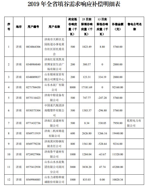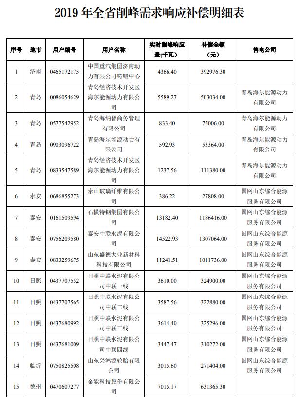 8月31日,山東省能源局印發(fā)關(guān)于2019年度電力需求響應(yīng)補(bǔ)償?shù)墓。公告稱,前期,按照《關(guān)于開展2019年電力需求響應(yīng)工作的通知》(魯能源電力字〔2019〕176號(hào))的有關(guān)要求,對(duì)公示期間反饋的意見逐一核實(shí)并吸收采納。現(xiàn)按程序?qū)?019年電力需求響應(yīng)補(bǔ)償相關(guān)事項(xiàng)進(jìn)行公告,并接受社會(huì)監(jiān)督。1.2019年全省削峰需求響應(yīng)補(bǔ)償明細(xì)表2.2
