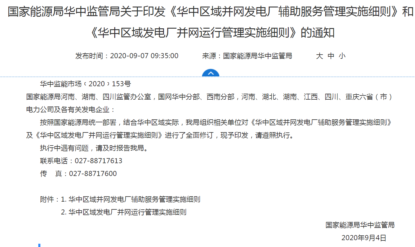 從國(guó)家能源局華中能監(jiān)局官網(wǎng)獲悉,日前,《華中區(qū)域并網(wǎng)發(fā)電廠輔助服務(wù)管理實(shí)施細(xì)則》和《華中區(qū)域發(fā)電廠并網(wǎng)運(yùn)行管理實(shí)施細(xì)則》正式印發(fā)。兩個(gè)細(xì)則明確包含電化學(xué)儲(chǔ)能電站在內(nèi)的電廠均適用于該規(guī)則。