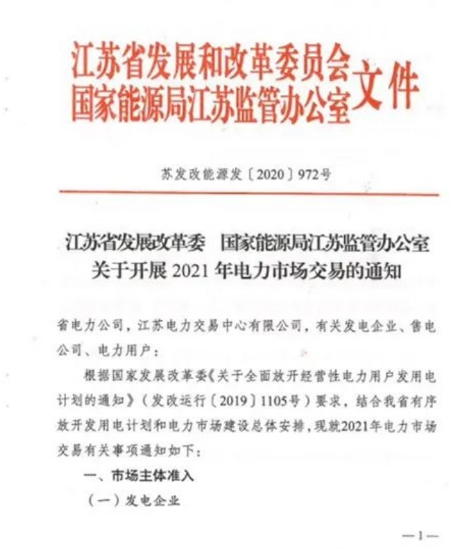 從江蘇省發(fā)改委官網(wǎng)獲悉:日前,江蘇省發(fā)改委印發(fā)《關(guān)于開展2021年電力市場交易的通知》(以下簡稱《通知》),全面放開用電電壓等級10kV及以上的用戶進入市場,釋放改革紅利給更廣泛用戶。