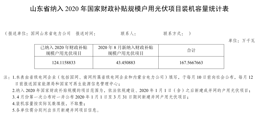 根據(jù)《國(guó)家能源局綜合司關(guān)于2019年戶用光伏項(xiàng)目信息公布和報(bào)送有關(guān)事項(xiàng)的通知》(國(guó)能綜通新能〔2019〕45號(hào))工作要求,國(guó)網(wǎng)山東電力有限公司對(duì)2020年8月份新增戶用光伏項(xiàng)目進(jìn)行了梳理,現(xiàn)將相關(guān)信息進(jìn)行公布。附件1:山東省納入2020年國(guó)家財(cái)政補(bǔ)貼規(guī)模戶用光伏項(xiàng)目裝機(jī)容量統(tǒng)計(jì)表(8月)附件2:附件2:山