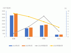 1-8月,東、中、西部和東北地區(qū)2全社會(huì)用電量分別為22498、8962、13473和2743億千瓦時(shí),同比增長(zhǎng)分別為-0.6%、-1.6%、4.0%和0.4%。