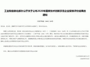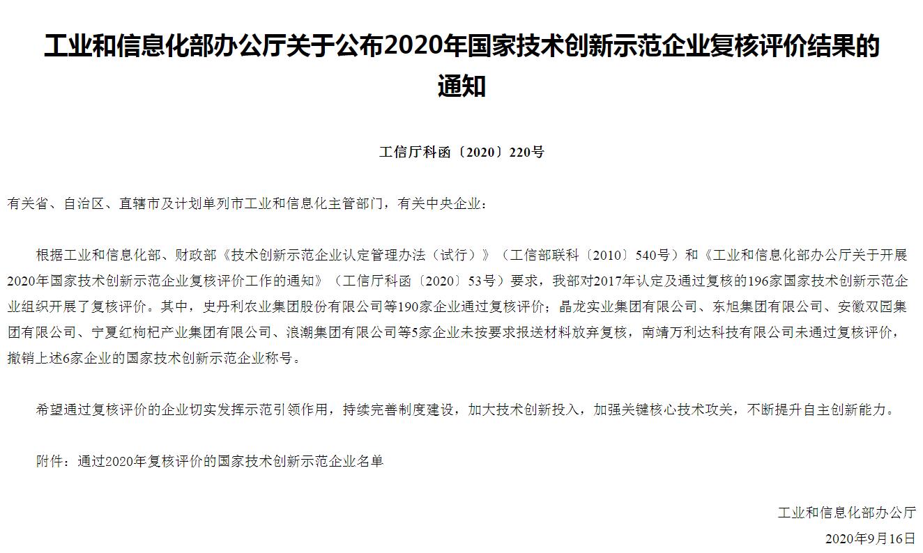 根據(jù)工業(yè)和信息化部、財政部《技術(shù)創(chuàng)新示范企業(yè)認(rèn)定管理辦法(試行)》和《工業(yè)和信息化部辦公廳關(guān)于開展2020年國家技術(shù)創(chuàng)新示范企業(yè)復(fù)核評價工作的通知》要求,工信部對2017年認(rèn)定及通過復(fù)核的196家國家技術(shù)創(chuàng)新示范企業(yè)組織開展了復(fù)核評價,190家企業(yè)通過了復(fù)核評價,晶龍實業(yè)集團(tuán)有限公司、東旭集團(tuán)有限公司、安徽雙園集團(tuán)有限公司、寧夏紅枸杞產(chǎn)業(yè)集團(tuán)有限公司、浪潮集團(tuán)有限公司等5家企業(yè)未按要求報送材料放棄復(fù)核,南靖萬利達(dá)科技有限公司未通過復(fù)核評價,撤銷上述6家企業(yè)的國家技術(shù)創(chuàng)新示范企業(yè)稱號。