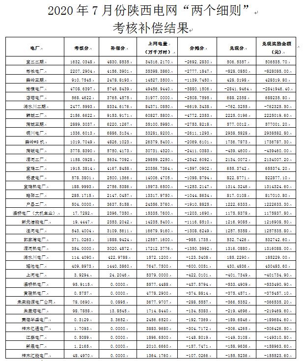 根據(jù)《國家能源局西北監(jiān)管局關于印發(fā)<西北區(qū)域發(fā)電廠并網(wǎng)運行管理實施細則>及<西北區(qū)域并網(wǎng)發(fā)電廠輔助服務管理實施細則>的通知》(西北監(jiān)能市場〔2018〕66號)規(guī)定,2020年7月份陜西電網(wǎng)發(fā)電廠并網(wǎng)考核和輔助服務補償結果復核工作已完成,現(xiàn)予公布,請據(jù)此結算。