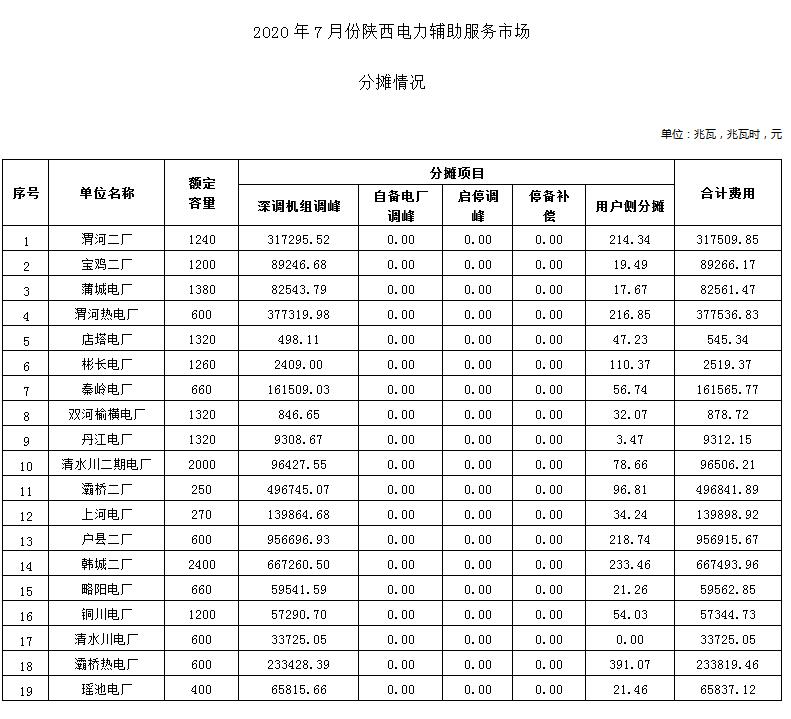 關(guān)于公布2020年7月份陜西電力輔助服務(wù)市場補(bǔ)償分?jǐn)偳闆r的通知