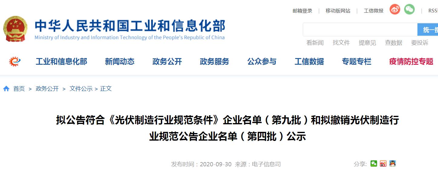 9月30日,工信部擬公告符合《光伏制造行業(yè)規(guī)范條件》企業(yè)名單(第九批)和擬撤銷光伏制造行業(yè)規(guī)范公告企業(yè)名單(第四批)公示,13家符合、7家撤銷。