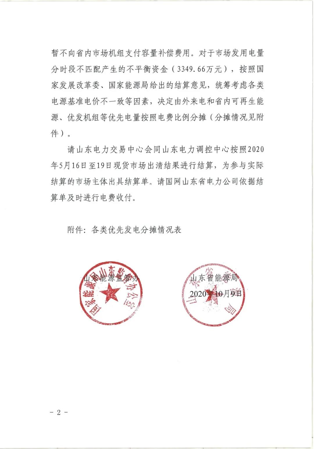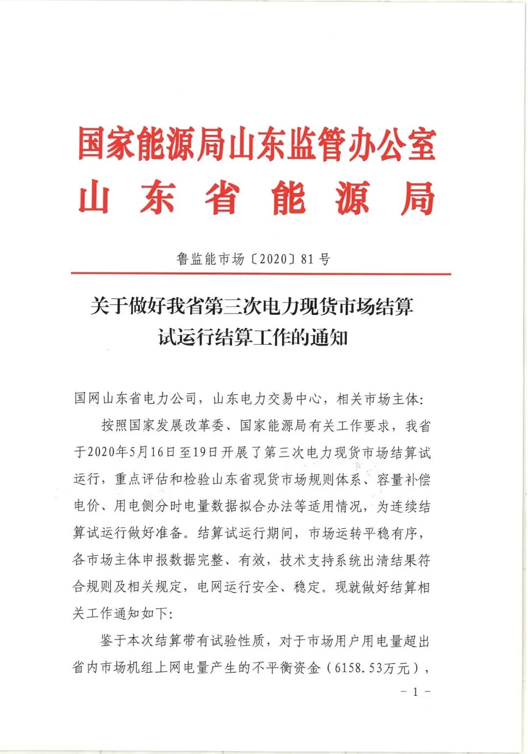 10月9日,山東能源監(jiān)管辦、山東省能源局發(fā)布《關(guān)于做好我省第三次電力現(xiàn)貨市場結(jié)算試運行結(jié)算工作的通知》。根據(jù)通知,2020年5月16-19日山東省開展的連續(xù)4天電力現(xiàn)貨市場結(jié)算試運行迎來了結(jié)算。通知文件明確,鑒于本次結(jié)算帶有試驗性質(zhì),對于市場用戶用電量超出省內(nèi)市場機(jī)組上網(wǎng)電量產(chǎn)生的不平衡資金(6158.53萬元),暫不
