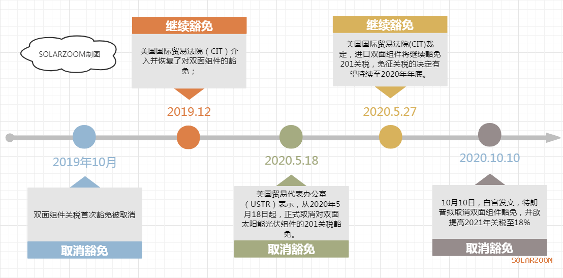 2020年10月,美國白宮發(fā)布聲明稱,為保證征收關(guān)稅的效果,特朗普擬取消雙面組件豁免,并欲提高2021年關(guān)稅至18%。