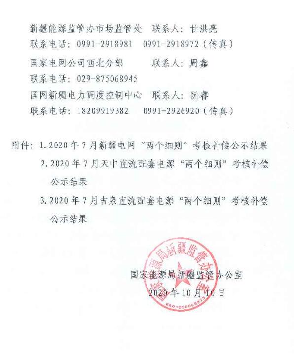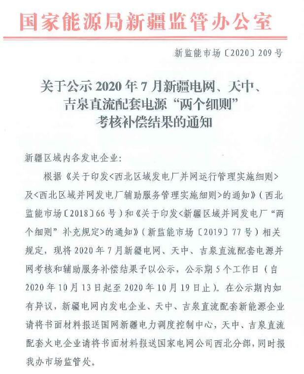 7月新疆電網(wǎng)、天中、吉泉直流配套電源“兩個細則”考核補償情況公示