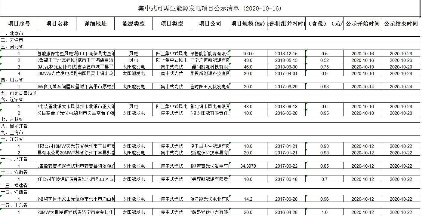 國(guó)家電網(wǎng)集中式可再生能源發(fā)電項(xiàng)目公示清單(10月16日)