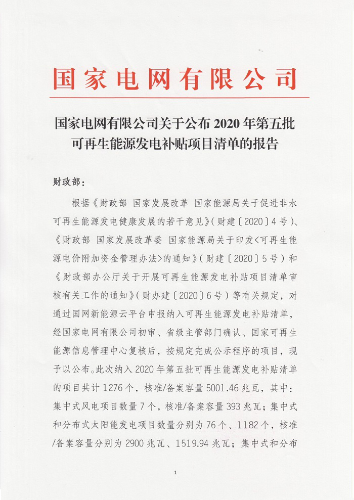 從國(guó)家電網(wǎng)能源云網(wǎng)獲悉:國(guó)家電網(wǎng)今日(19日)發(fā)布關(guān)于公布2020年第五批可再生能源發(fā)電補(bǔ)貼項(xiàng)目清單的公告。