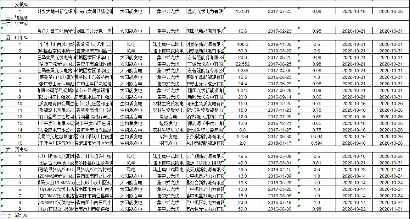 10月23日,國(guó)家電網(wǎng)公示了最新一批的可再生能源發(fā)電補(bǔ)貼項(xiàng)目清單,共計(jì)63個(gè)太陽(yáng)能發(fā)電、風(fēng)電、生物質(zhì)發(fā)電項(xiàng)目,涉及河北(4)、山西(1)、江蘇(2)、遼寧(1)、浙江(10)、安徽(1)、江西(1)、山東(16)、河南(9)、湖南(4)、四川(1)、西藏(3)、陜西(1)、甘肅(3)、寧夏(3)、新疆(3)15個(gè)省份。