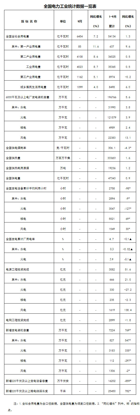 國(guó)家能源局發(fā)布1-9月份全國(guó)電力工業(yè)統(tǒng)計(jì)數(shù)據(jù)