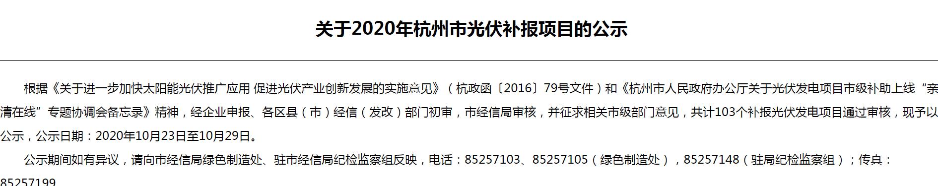 10月22日,杭州市經濟和信息化局發(fā)布《關于2020年杭州市光伏補報項目的公示》,共涉及103個光伏項目,公示日期:2020年10月23日至10月29日。