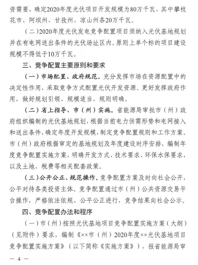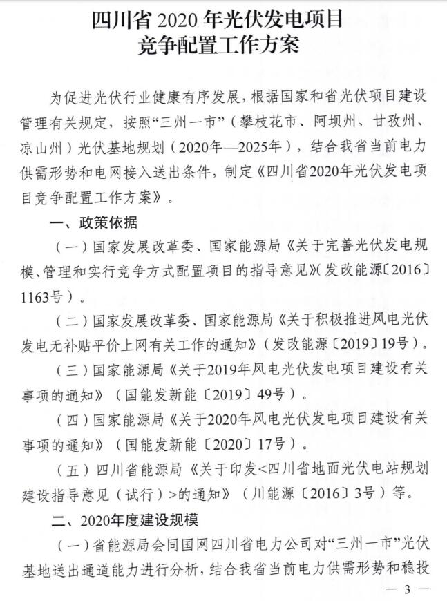 以下是《四川省2020年光伏發(fā)電項(xiàng)目競(jìng)爭(zhēng)配置工作方案》全文: