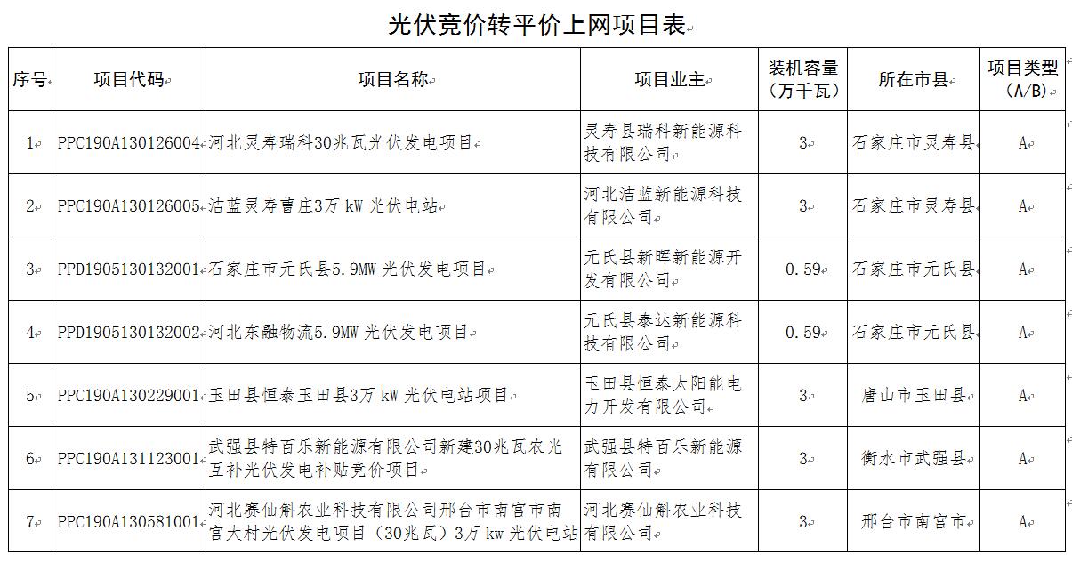 關(guān)于公布我省光伏競(jìng)價(jià)轉(zhuǎn)平價(jià)上網(wǎng)項(xiàng)目的通知有關(guān)市發(fā)展改革委、張家口市能源局,國(guó)網(wǎng)河北省電力有限公司、國(guó)網(wǎng)冀北電力有限公司::按照國(guó)家能源局《關(guān)于公布光伏競(jìng)價(jià)轉(zhuǎn)平價(jià)上網(wǎng)項(xiàng)目的通知》(國(guó)能綜通新能〔2020〕107號(hào))要求,現(xiàn)將我省光伏競(jìng)價(jià)轉(zhuǎn)平價(jià)上網(wǎng)項(xiàng)目予以公布,并就有關(guān)事項(xiàng)通知如下:一、國(guó)家公布我省光伏