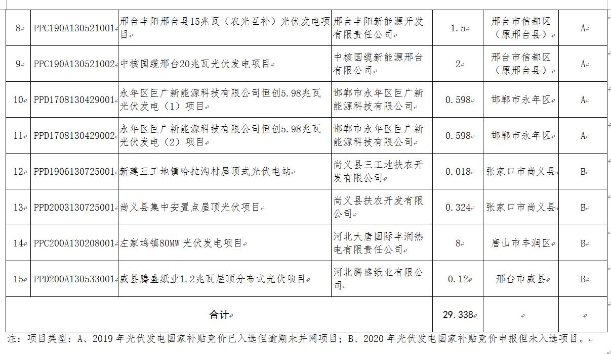 一、國(guó)家公布我省光伏競(jìng)價(jià)轉(zhuǎn)平價(jià)上網(wǎng)項(xiàng)目15個(gè)、29.338萬(wàn)千瓦。其中,2019年光伏發(fā)電國(guó)家補(bǔ)貼競(jìng)價(jià)已入選但逾期未并網(wǎng)項(xiàng)目11個(gè)、20.876萬(wàn)千瓦,2020年光伏發(fā)電國(guó)家補(bǔ)貼競(jìng)價(jià)申報(bào)但未入選項(xiàng)目4個(gè)、8.462萬(wàn)千瓦。具體名單見(jiàn)附件。請(qǐng)各市督促企業(yè)加快項(xiàng)目建設(shè),確保在國(guó)家規(guī)定并網(wǎng)時(shí)限(2021年12月31日)前建成并網(wǎng)。逾期未并網(wǎng)項(xiàng)目,將視為自動(dòng)放棄,相關(guān)備案文件自動(dòng)失效。本批所公布項(xiàng)目并網(wǎng)時(shí)限與《關(guān)于加快推進(jìn)風(fēng)電、光伏發(fā)電在建項(xiàng)目建設(shè)的通知》(冀發(fā)改能源〔2020〕1051號(hào))不一致的,以本通知為準(zhǔn),其它項(xiàng)目并網(wǎng)時(shí)限不變。